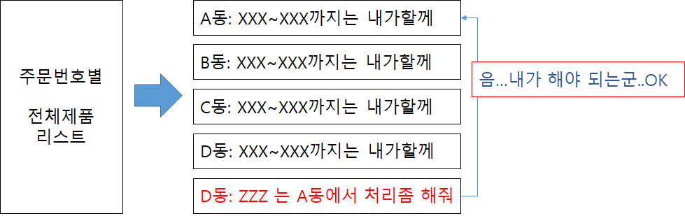 물류창고의 범위가 크다보니 각 물류창고 동별로 해당 품목의 포장이 각각 독립적으로 이루어지다보니, 경우에 따라서는 배송의 비용 절감을 위하여 타 동에서 포장을 해야하는 경우가 발생합니다.