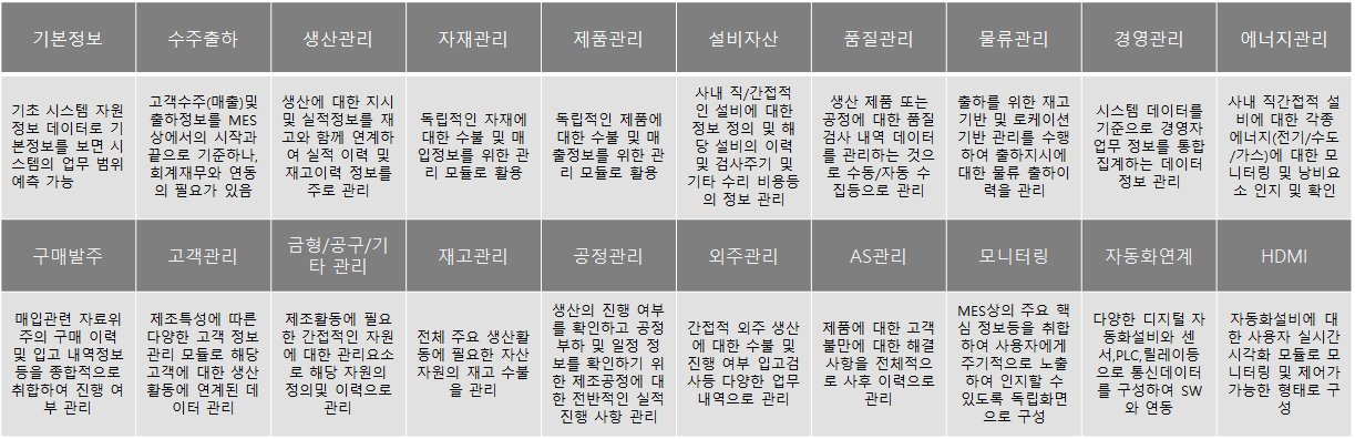 MES(제조실행시스템) 구축에 필수기능과 같이 기능 범위 개념이 있을까요? 본문