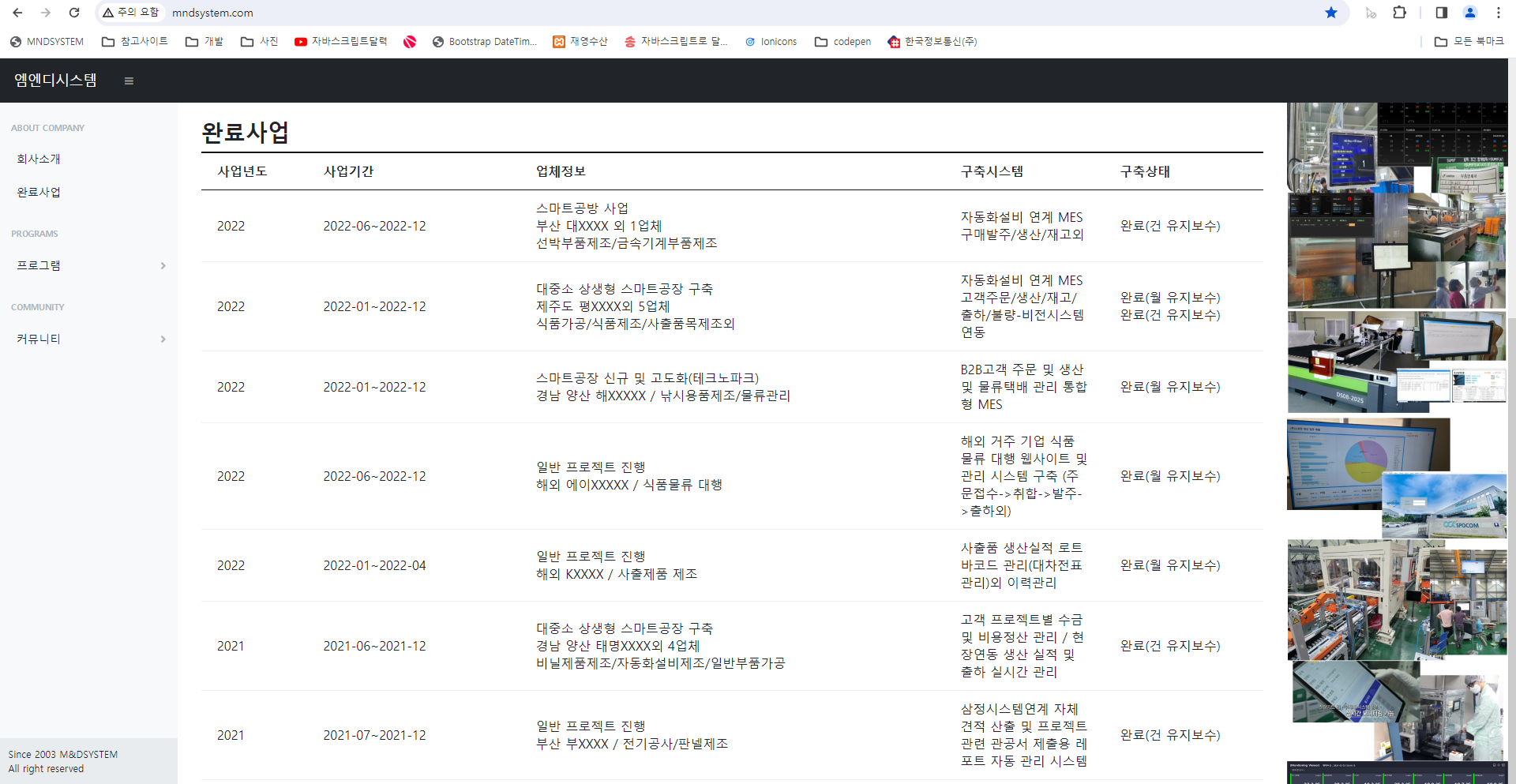 완료사업 페이지는 엠엔디시스템이 스마트공장 및 일반 프로젝트의 완료 이력을 작성한 페이지 입니다. 완료사업이 너무 많이 전체를 적진 못하고 특별히 인상 깊었던 프로젝트를 선정해 작성하였습니다. 홈페이지에 방문하여 엠엔디시스템이 어떤 프로젝트를 진행하였는지 확인해주세요!