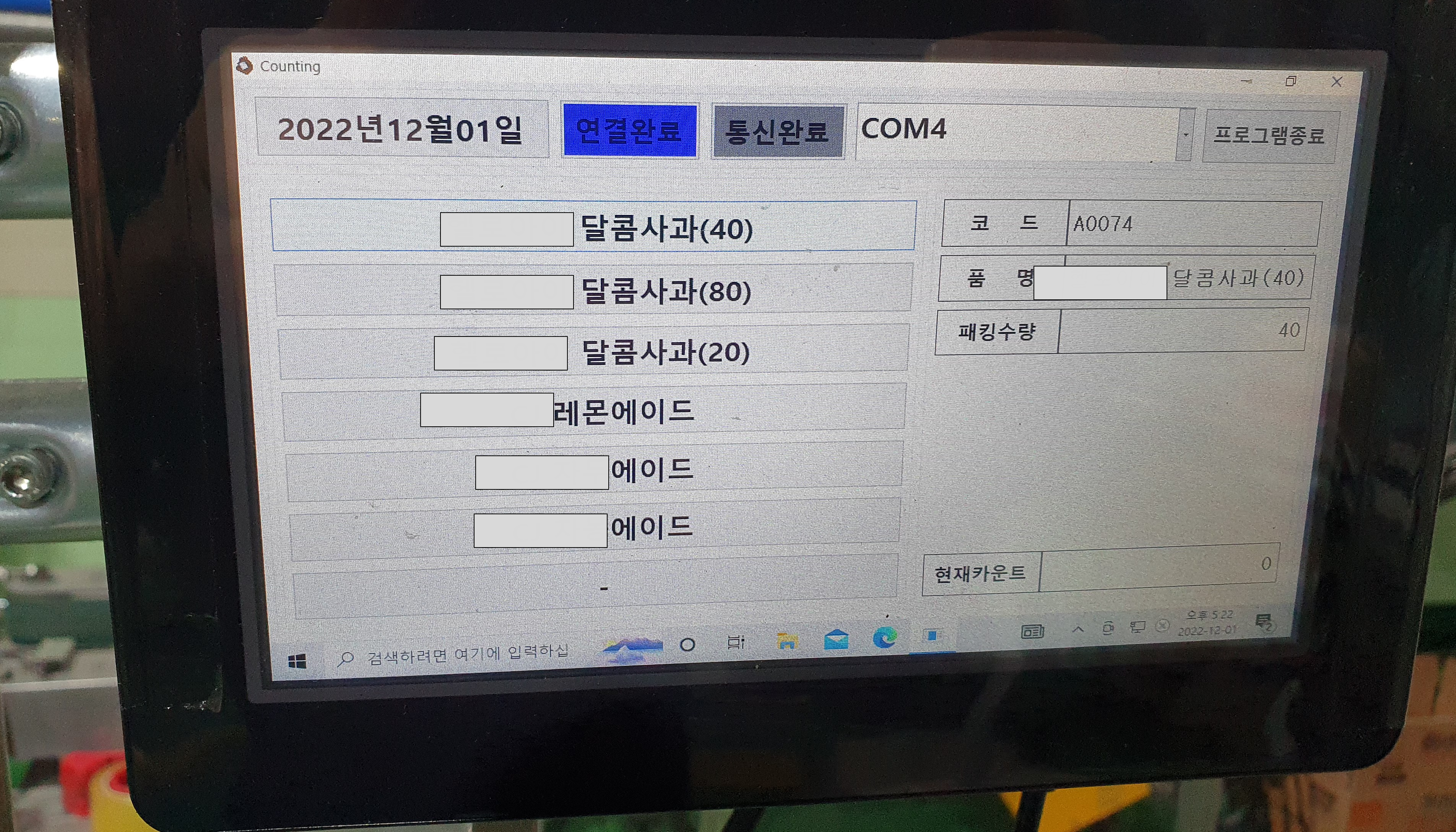 제품이 컨베이어 벨트에서 센서를 지나갈때마다 1카운트씩 적외선 센서가 감지함. (유선으로 데스크탑PC와 연결하여 데이터 통신)