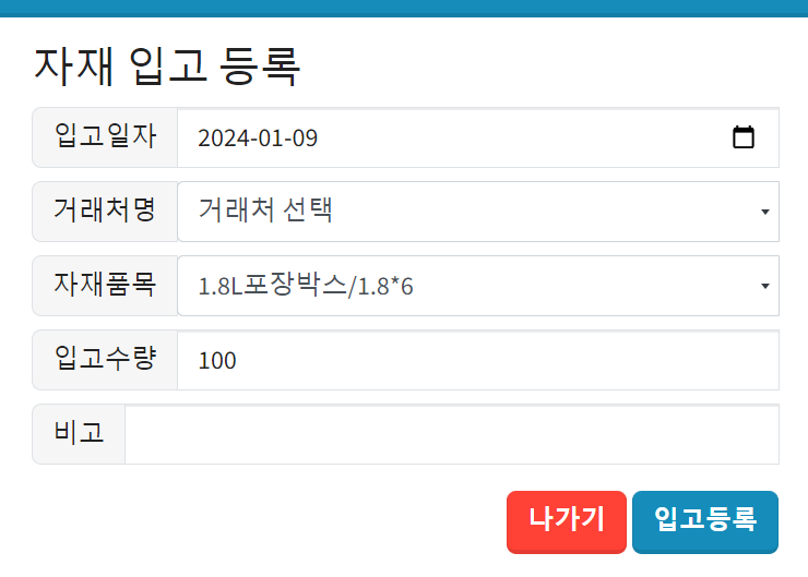 또한 자재 입고되었을때 바로 등록하기 위한 태블릿에서의 입고등록화면입니다.