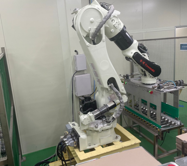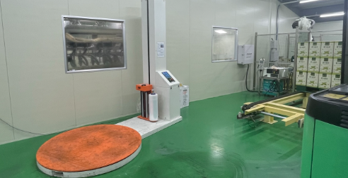 생산된 제품을 로봇팔이 빠레트에 적재하고 래핑후 제품을 창고에 적재합니다.
