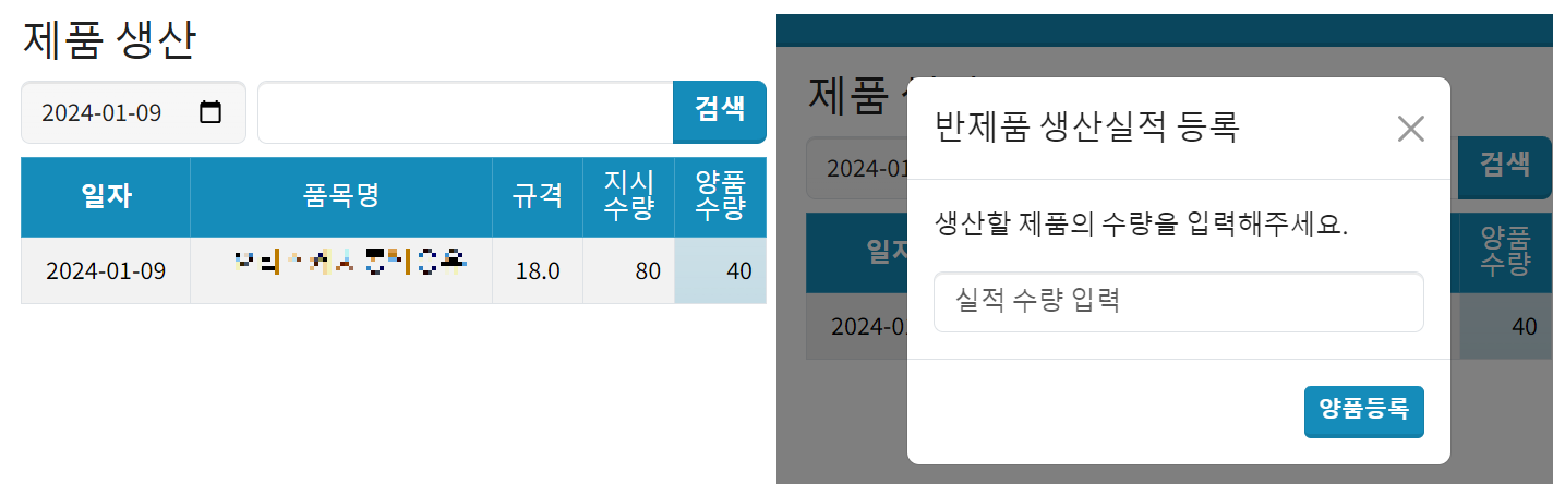태블릿에선 이런식으로 재고 조회 및 생산관련 기능들을 개발하였습니다