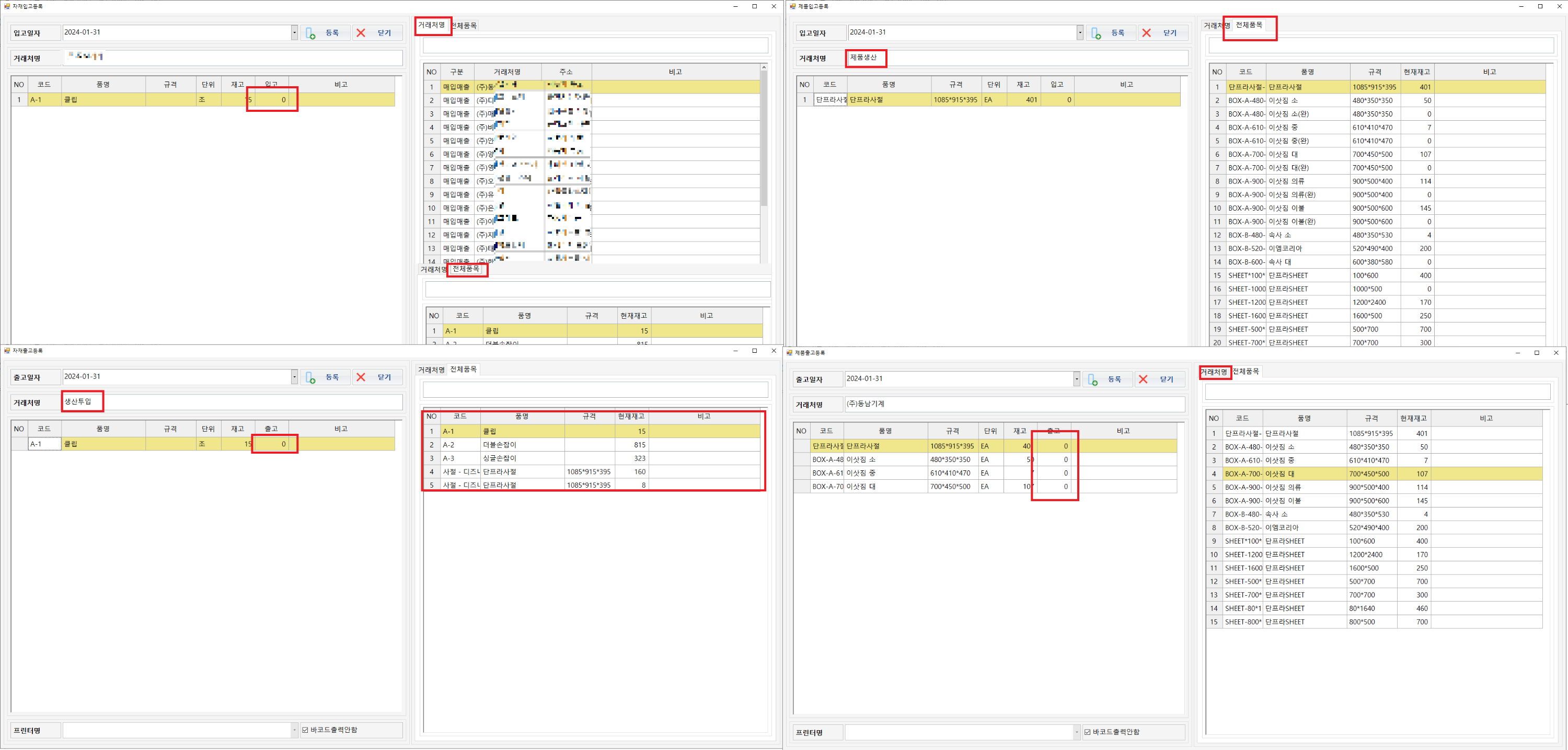 제품출고 : 거래처명 -> 해당자재 -> 수량입력 -> 처리