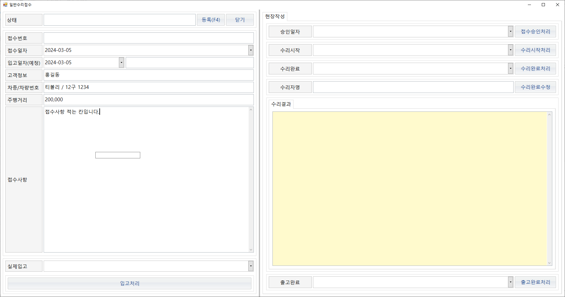 프로그램에서 수리 등록 화면 먼저 보겠습니다.