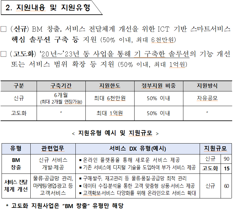크게 신규 / 고도화로 나누어서 사업을 구분하고, 유형을 2가지로 나누어 공고가 개시되었습니다.