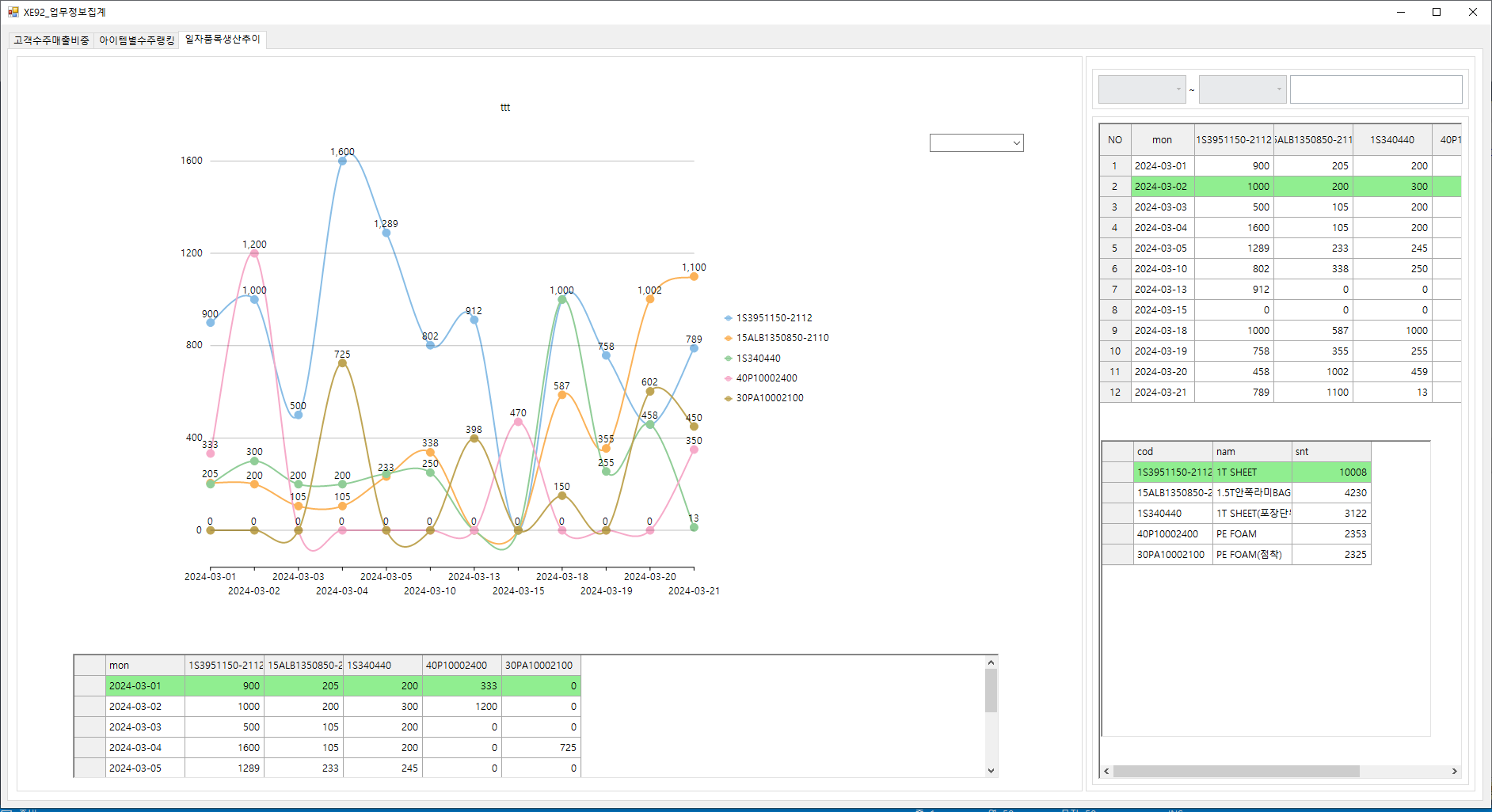 아이템별 생산추이도를 한번에 볼수 있도록 구현 되었습니다.