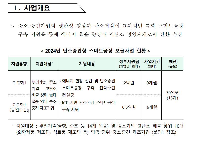 중소기업 제조 현장의 에너지 효율화, ICT 기반 탄소저감 공정혁신 등 저탄소 경영체계 구축 지원을 위하여 중소벤처기업부에서 추진 하고 있는 2024년도 탄소중립형 스마트공장 보급사업의 지원계획을 다음과 같이 공고합니다.