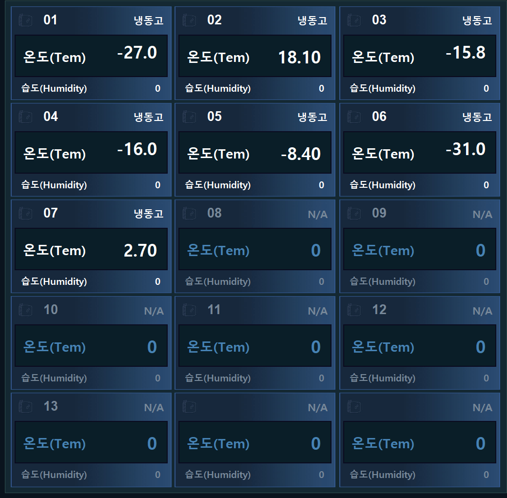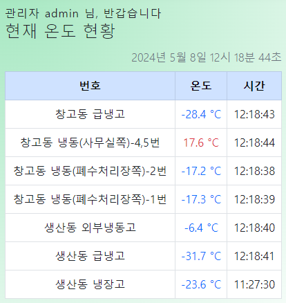 1번~7번 까지 각 창고별 온도를 확인 할수 있고 또한 적정온도를 설정하게 되고 적정온도를 벗어나게 되면 배경에 색을 다르게 하는 등의 효과를 주어 확인 할수있습니다 .
