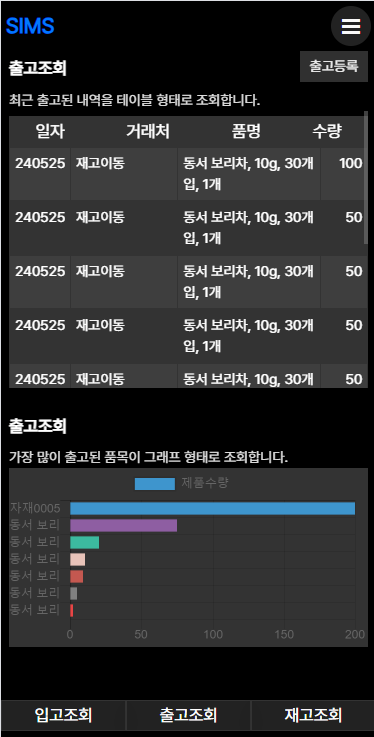 로그인을 하시면 위 이미지와 같이 3개의 화면이 슬라이드 형식으로 제공됩니다. SIMS - PC 프로그램에서 등록된 기본정보를 바탕으로 입고내역/출고내역/사내재고 등을 조회할 수 있습니다. 그리고 차트 형식으로 가장 많이 입고/출고된 품목의 수량을 차트 형식으로도 조회할 수 있습니다.