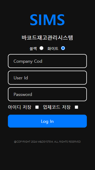 심스 바코드 재고관리시스템은 기호에 따라 블랙/화이트 버전을 나누고 있으며, 오늘 소개해드릴 버전은 화이트 버전입니다. 로그인을 위해서는 업체코드/아이디/비밀번호가 필요하며, 업체코드와 아이디는 버튼을 통해 저장 할 수 있습니다.