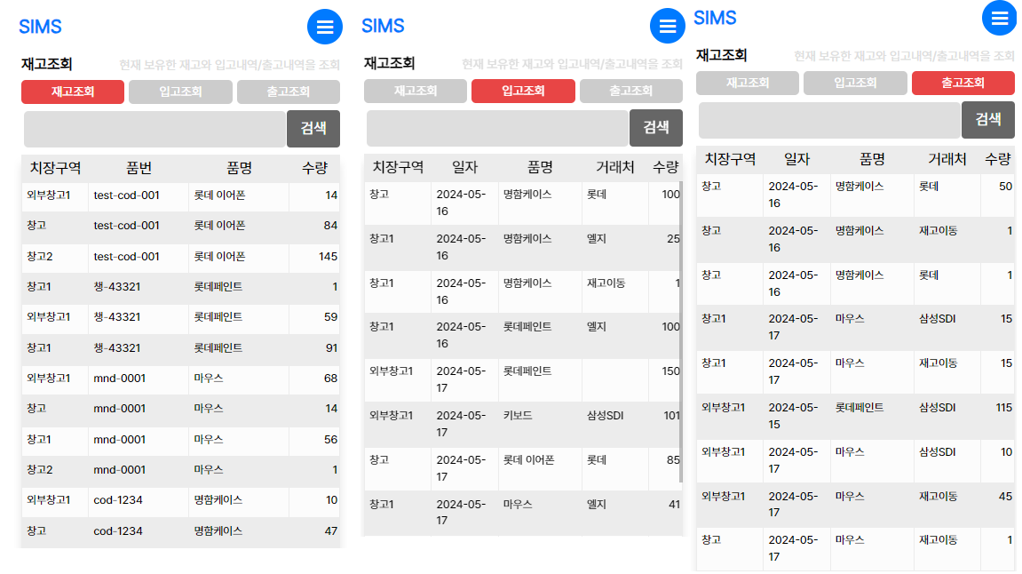SIMS 바코드 재고관리시스템의 조회화면은 재고조회/입고조회/출고조회 순으로 조회가 가능하며 홈화면보다 상세한 정보를 조회 할 수 있습니다. 그리고 검색창에 품명을 입력하여 검색한다면, 검색이 가능합니다.