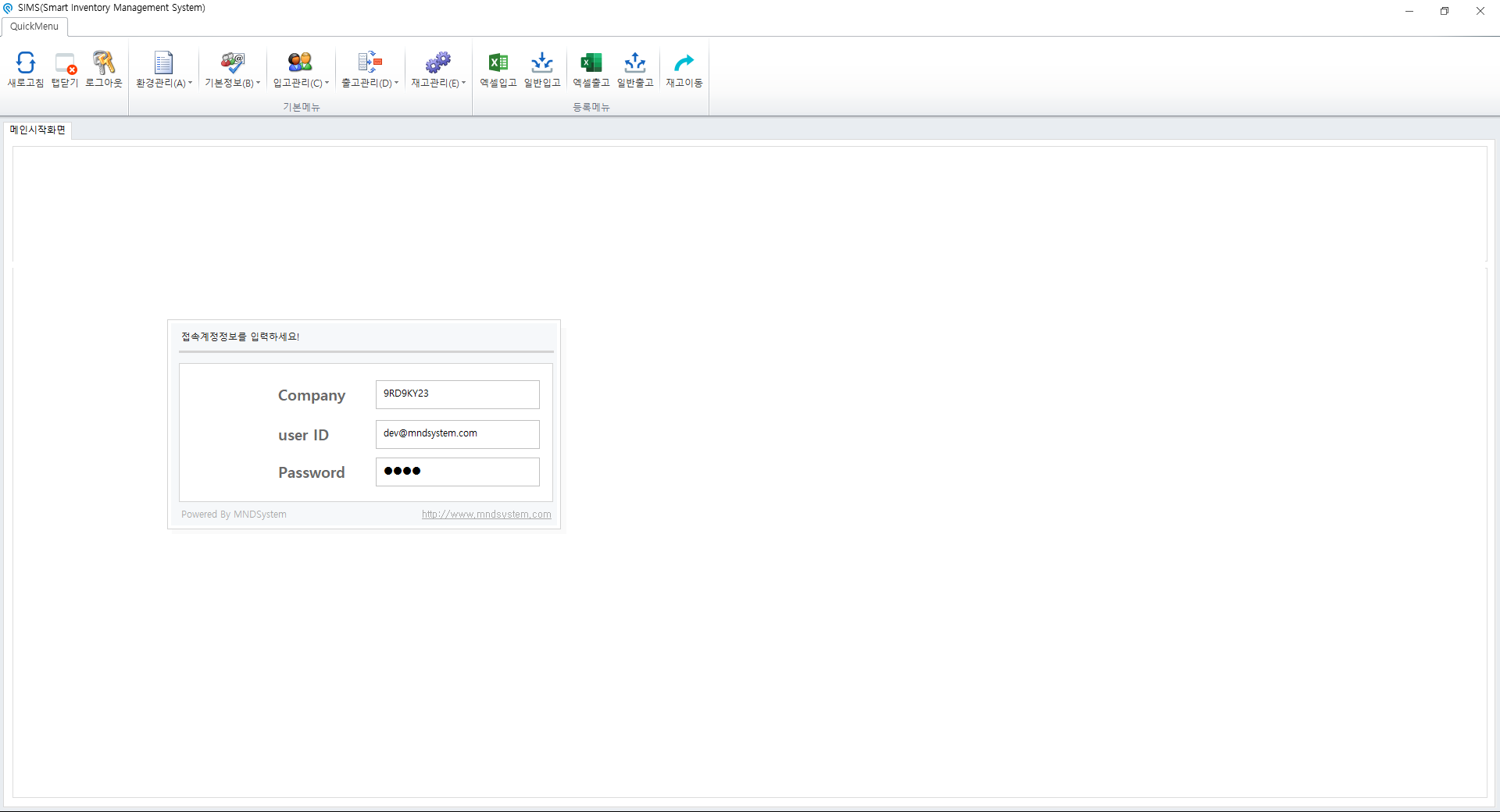 SIMS 바코드 재고 관리시스템의 로그인 화면 입니다. 업체코드, 아이디 비밀번호로 구성되어 있으며 로그인 후 업체코드 및 아이디는 저장되어 있습니다.
