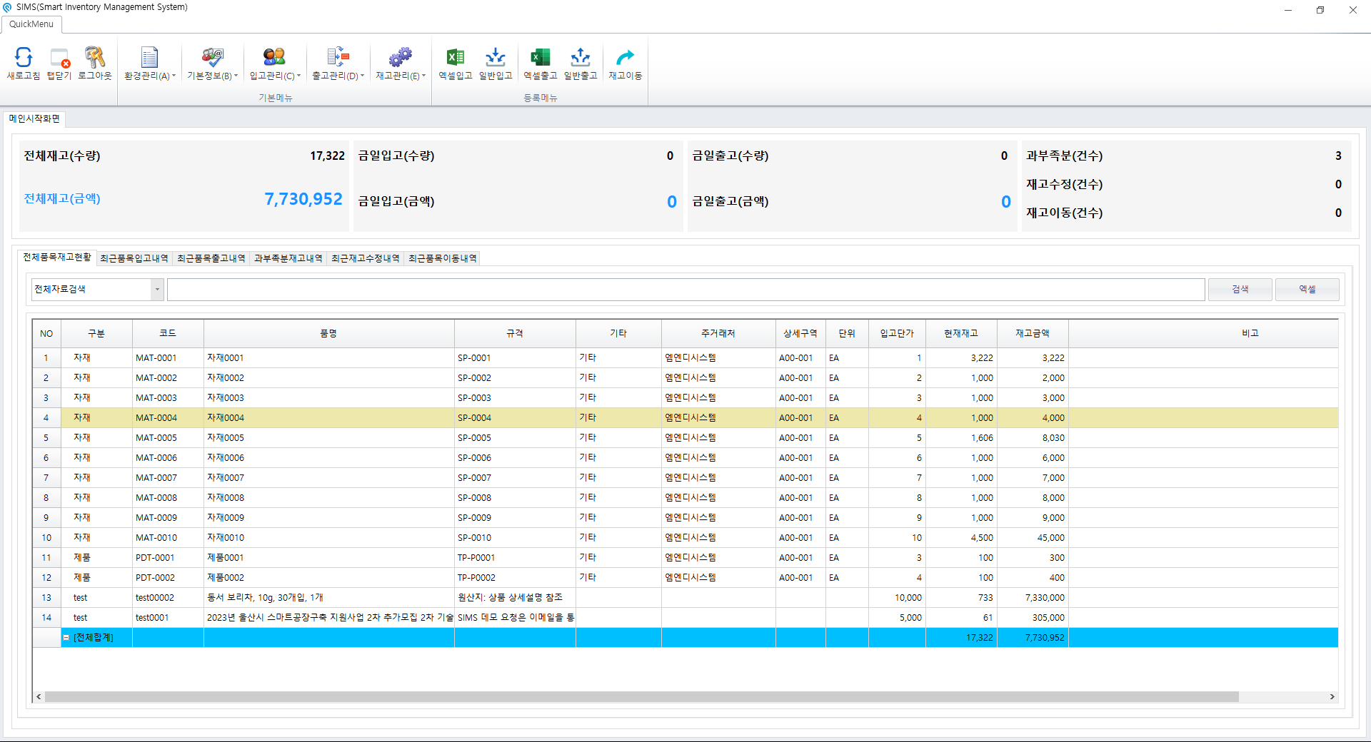 메인시작화면으로 접속하게 되며 메인 접속화면에서는 전체 재고 수량과 전체 재고(금액), 금일 입출고 및 과부족에 대한 정보를 볼 수 있으며, 전체 품목 재고현황, 최근 품목 출고내역 과부족분재고내역, 최근 재고 수정내역, 최근 품목이동내역과 같은 프로그램에서 사용한 전반적인 수불 데이터를 조회 할 수 있습니다.