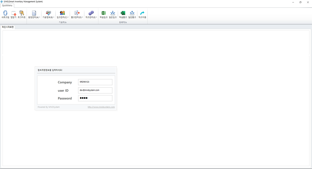 SIMS 바코드 재고 관리시스템의 로그인 화면 입니다. 업체코드, 아이디 비밀번호로 구성되어 있으며 로그인 후 업체코드 및 아이디는 저장되어 있습니다.