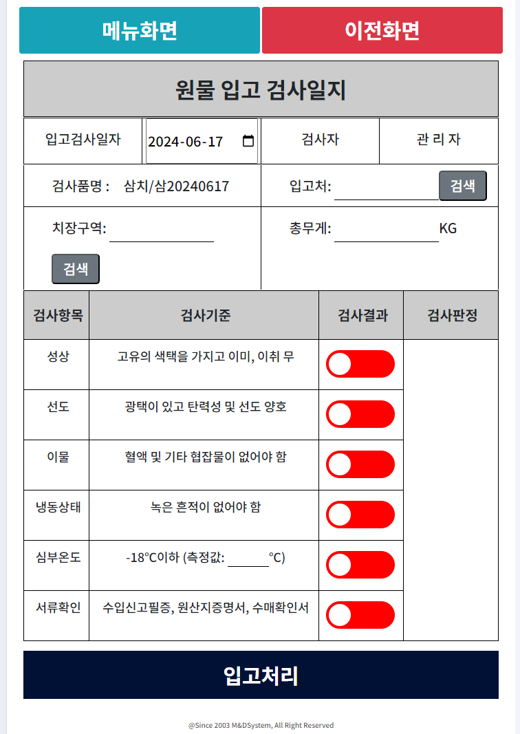 위 화면은 태블릿/모바일 기기로 등록하는 검사일지 화면입니다. 입고처를 비롯해 치장구역, 수량을 입력해주고 검사 항목에 대한 체크를 진행해 주면 됩니다. 아무래도 별도의 종이 문서로 관리하는 것이 아닌 검사결과를 DB에 등록하고 이를 조회할 수 있어 검사결과 관리에 매우 효율적이라고 할 수있습니다.