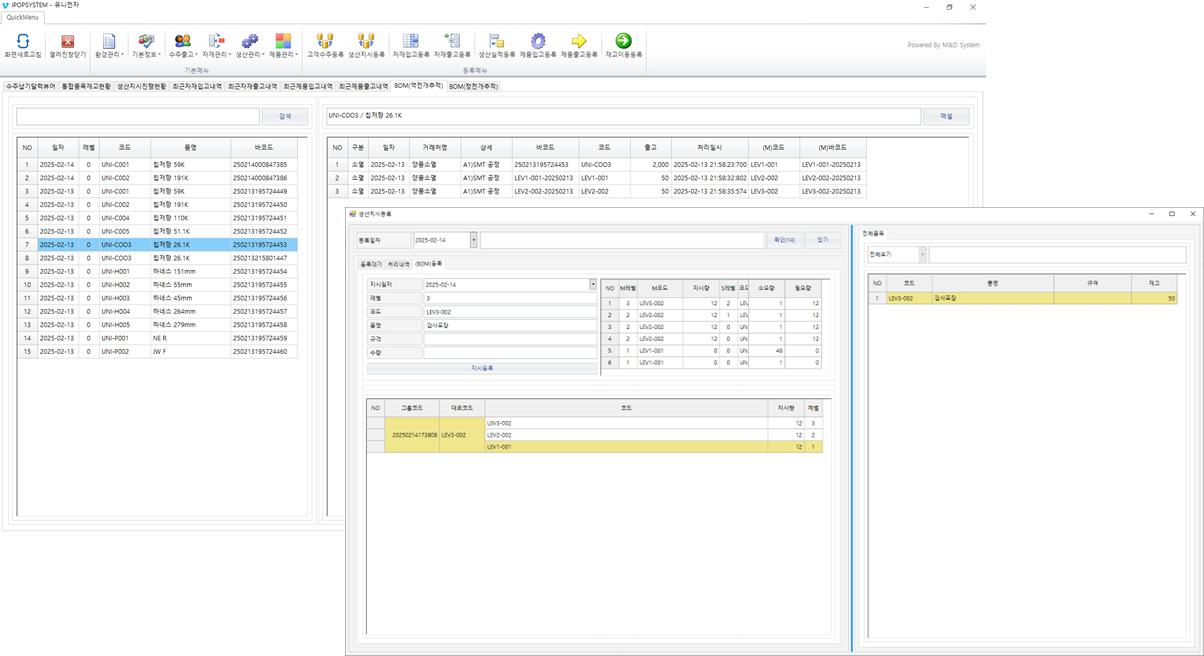 두번째 핵심과제는 BOM기반으로 각각의 생산라인에서 조립실적에 대한 재공재고는 기본으로 하고, 해당 제품들의 생산 추적이 가능한지를 관리할 수 있는지 여부였습니다!
