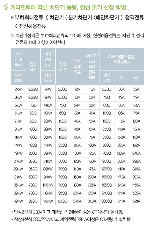 케이블과 차단기의 쿩기및 허용전류는 차트를 통해 알아볼수 있다