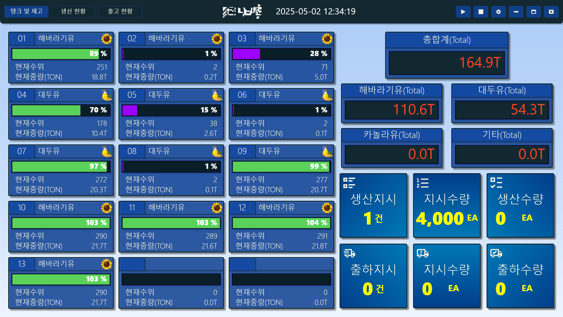 식품 제조업체 나OO은 해바라기유·대두유 등의 원재료 수위를 자동으로 수집해 표시합니다. 부족분을 사전에 알림받아 생산 중단 없는 스마트한 관리가 가능합니다.